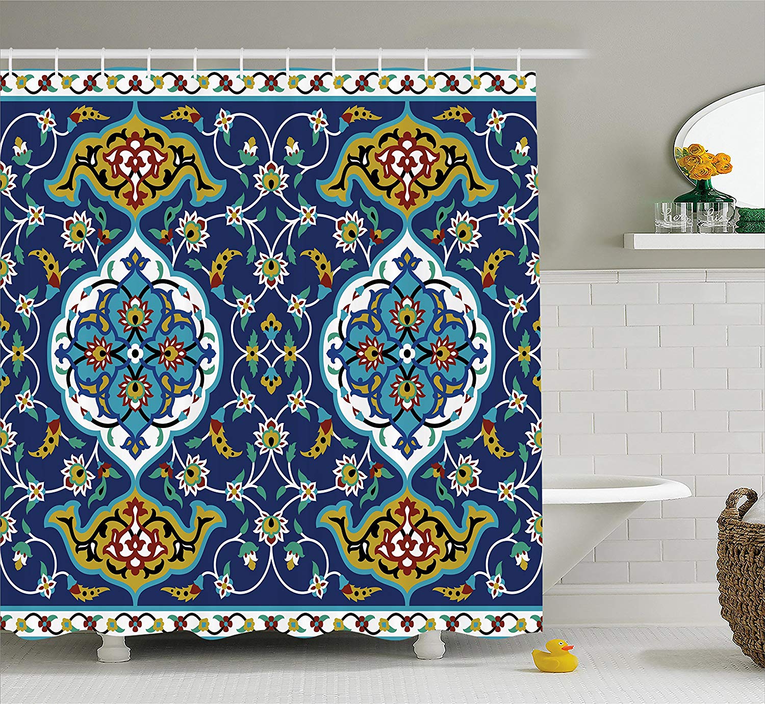 A work of art on a shower curtain! This piece displays a gorgeous pattern of plants in vibrant colors that will entice you to step into the shower to relax and get away from it all!